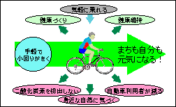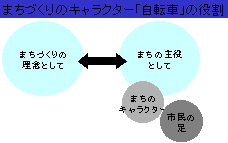 キャッチフレーズに示したまちづくりの実現に向け、「元気」「回遊性」というイメージを持つ自転車を土浦市のキャラクターとし、自転車を中心としたマスタープランを構成します。まちづくりのキャラクターである「自転車」には、次のような3つの効用があります。