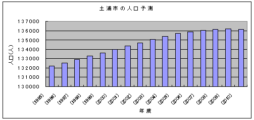「土浦の統計」によるデータをもとにコーホート分析を行ったところ、その結果は、右のグラフのようになります。これによると、2009年をピークに人口が減少することが予想され、2010年では136000人を少し超える程度にとどまっていることがわかります。