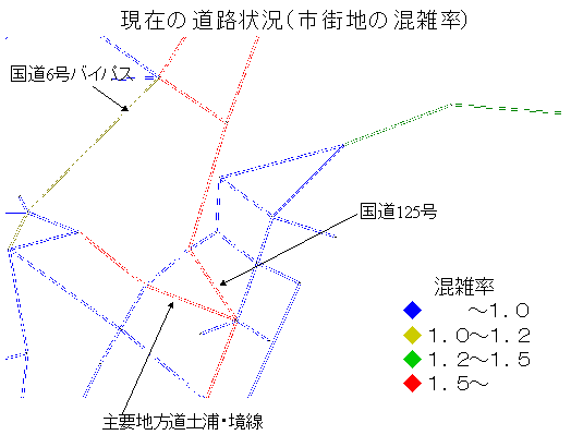 国道6号のバイパス付近、国道125号、土浦駅前付近では、特に混雑が目立ちますが,それは、それらの交通量が交通容量をはるかに越えていることが原因と考えられます。(図.2.5)