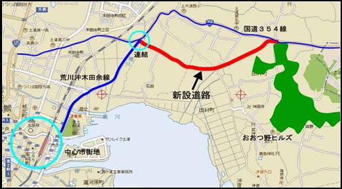 ・ルート/「おおつ野ヒルズ」から新規道路を建設し、荒川沖木田余線と連結する。