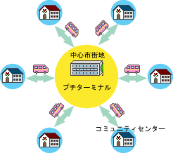 コミュニティセンターから中心市街地にあるプチターミナルまでを結ぶ小型ノンステップバス。