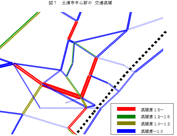 市民の移動手段として自動車は欠かせないものとなっている。茨城県生活行動圏調査によると日常の行動(買い物、余暇など)において自動車を使う人の割合は2000年度時点で90%を超えている(図参照)。自動車利用による市民の便益は大きい。例えば、乗り換えをせずに目的地まで到達できる、天候による行動制約が弱いなどである。しかし、それによりもたらされる悪影響も大きい。例えば、自動車ユーザーにとって便利なロードサイドショップが乱立することにより中部の商業が衰退するかもしれない、中心部における慢性的な交通混雑が生じる、などである。図は現在の土浦市の交通状況をjicaにより見たものである。図中の赤色の線は道路混雑がひどいところである。現場の写真はそのような場所の写真の一部である。土浦ではjicaによる把握はできなかったが、他にも渋滞のポイントが多々ある。