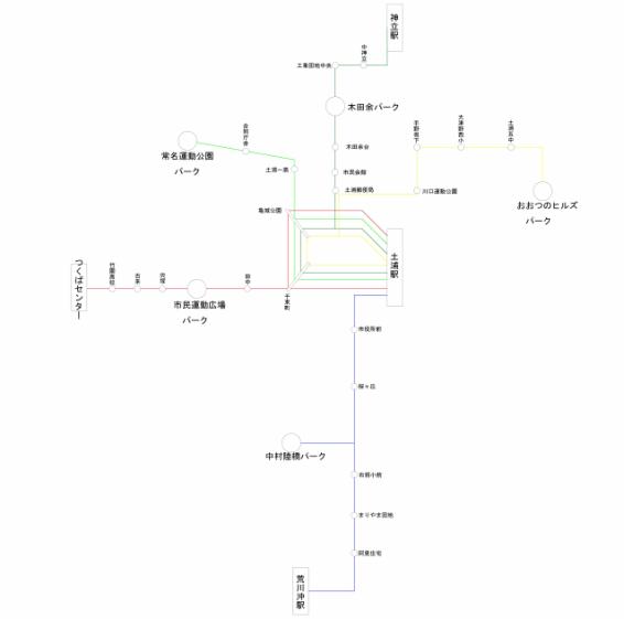 土浦駅西口→土浦郵便局→木田余台パーク→工業団地中央→神立駅