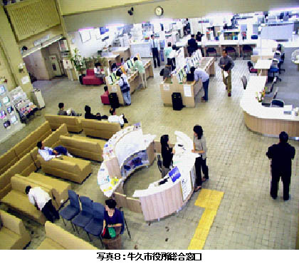 下の図は牛久市役所で昨年の1月から行われている総合窓口のイメージ図である。牛久市役所に来た市民は入り口の前にある総合案内にいるフロアマネージャーの案内を受ける。その後各証明書発行の申込書や届出の書類を記載し、番号発見器でカードを受け取り、中央の待合スペースで待つ。そしてこのフロアだけで諸証明部門、住所変更、戸籍関連、医療年金、介護保険、児童福祉、納税、下水道、環境管理など205業務のサービスを受けることが出来る。また、各書類の記述や各窓口の案内を分かり易くし従来の市役所のイメージを変えている。