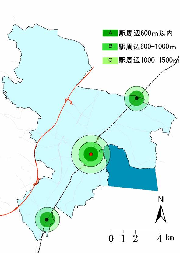 市街地のスプロールを抑制するには、自動車での移動をこれまでよりも少なくさせ、公共交通の利用を促進することの 影響が大きい。このことから私たちは市内にある常磐線の3つの駅に着目をした。また各駅周辺は、生活環境がある程度 充実していることもあり、各駅を中心とする「土浦エリア」「神立エリア」「荒川沖エリア」を重点整備計画地として選定した。