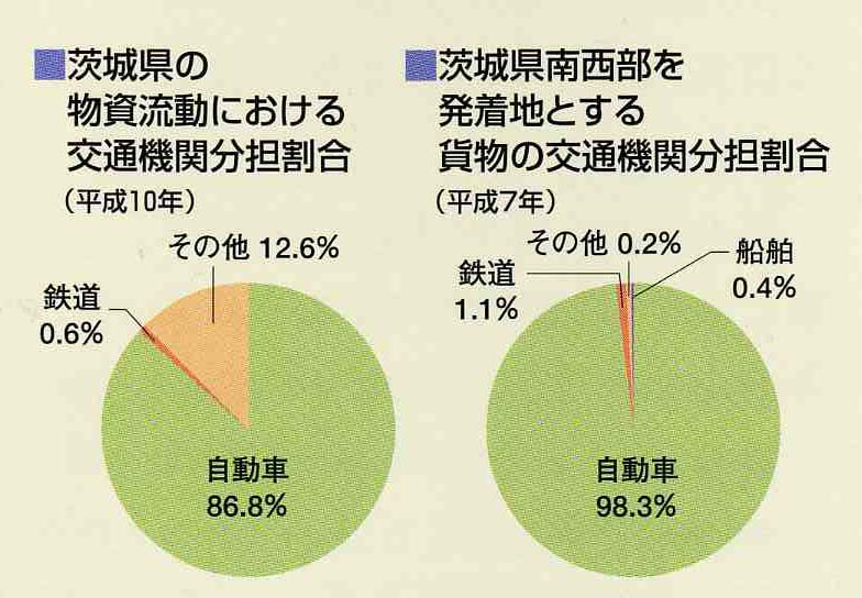 図.5のように、茨城県の物資流動では自動車が87%を占めていることから、茨城県全体が自動車依存社会であると言える。