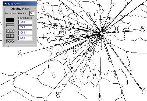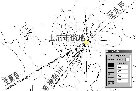 図.7より、阿見町・つくば市・水戸市方面への自動車での移動が多いことがわかる。図.8より、許容量を越えた交通需要が発生していることがわかる。図.7・図.8から、交通需要の多いトリップが存在しているゾーン間は許容量を超えた交通により道路が混雑している。