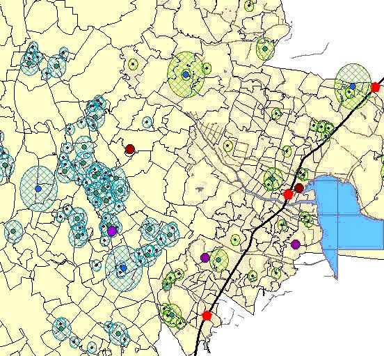 各公園の来訪者を集められる距離をもとに調査したところ、つくば市では人口密集地のほぼ全域が、公園の影響圏によってカバーされていたのに対して、土浦市ではほとんどカバーできていないことがわかった。