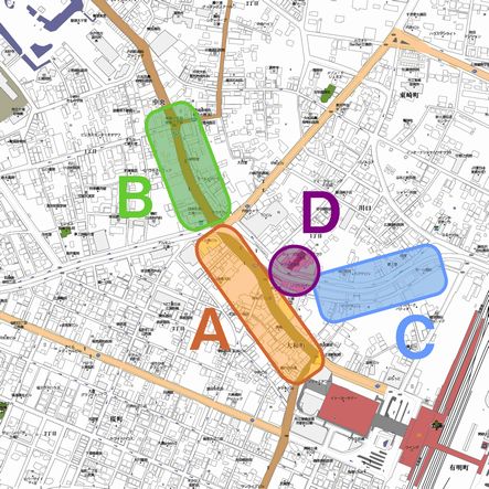今回は、中心市街地の駅から亀城公園に向かう通り沿いについて、重点的に検討することとした。ここで設定するエリアとそのテーマは以下の通りである。