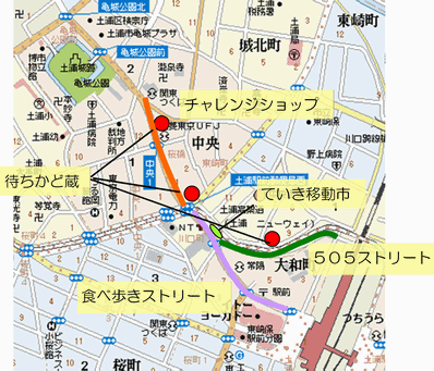 まず、「食べ歩きストリート」では手軽に歩きながら食べられるものを販売する店舗の集積を図る。調理の様子が歩行者の目に留まることや、料理の香りが店の外に漂ってくるように工夫することで、歩行者の好奇心と食欲を刺激するような通りづくりを行う。 次に「505ストリート」では「食べ歩きストリート」との対比の意味も込めて、椅子に座ってゆっくり飲食を楽しむ空間を目指す。1階はレストランやカフェといった飲食店を主に誘致する。また、モール505の2階以上はSOHOとしても活用できる市街地居住の場としての整備を行う。1階の飲食店はここに住む居住者の利用も見込んでいる。 「チャレンジショップ」はすでに川口1丁目にて実施されている取り組みだが、ここではさらに幅広い年代の人が商業にチャレンジできる場としての利用を図る。例えば、小中高生が商業体験を行う場とすることも利用法の一つである。 続いて、先述の「ていき移動市」を市街地でも開催することを提案する。開催場所としては、川口町バス停近くの高架道下に広がる空間が考えられる。新治や神立の各地区から農産物や花きを運んできて、販売する。地産地消のアピールになることはもちろん、市の存在が歩行者の興味を引くとともに、「キララ」の流通の場ともなり、市街地のにぎわいづくりにつながる。 「待ちかど蔵」は歩行者が気軽に休憩できる場所として主要バス停付近や市街地の要所に整備する。単なる休憩の場としてだけでなく、学生や一般の市民が制作した芸術作品を展示するスペースとしての役割も持つ。 以上は図3-10の各区間・地点との対応も意識しながら施策を紹介してきたが、最後に、業種にかかわらず市街地の営業中の店舗には必ず「のれん」をかけるようにする。これはどの店がいま営業しているのかすぐにわかるようにすることと、街の雰囲気に一体感を持たせることに主眼を置くが、一方で、それぞれの店の個性を表現するものとしての役割もあり、街の眺めに視覚的な変化をつける意味合いもある。 なお、メインストリート計画のうち「待ちかど蔵」(イメージは図3-12)に関しては、土浦市のシンボルとなりうる施設である。そのため、中心市街地に限らず荒川沖や神立の主要バス停、あるいは公民館の一角に設置し、市民の憩いの場・交流の場としての役割を持たせる発展性も考えられる。 |