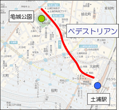 第3章 重点整備計画 (3)3.3. メインストリート計画3.3.1. コンセプト土浦駅前から亀城公園までの中心市街地の活性化を図るために、また他の政策の効果を中心市街地にも取り入れるために、メインストリート計画を提案する。この計画の方針は次の3点である。