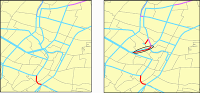 ペデストリアンウェイ化することにより、この道路への自動車の流入は長い期間に渡って完全に遮断される。その影響を検証するために、JICA-STRADAやCUETを用いて20年後の混雑度を分析した。結果は図3-9である。
