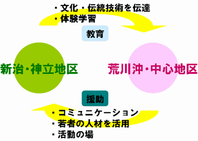 土浦市における「課題」と「資源」の有効利用を考えて、図3-9のような錬魂村を提案した。農をはじめとした土浦の農村の伝統的な文化・技術の体験を通して、都市部である中心地区・荒川沖地区などの子供たちの情操教育を行う。また、高校生・大学生など若い人材の市民活動の場としても位置付け、農業の人材確保を図る。 課題点:
