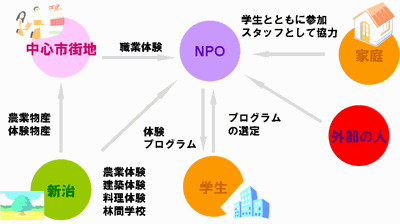 学生のサポートスタッフは、高齢者の農作業の手伝いや、企画・運営のサポート、プログラムの作成などを行う。これらの活動を通して農業や郷土への理解を深め、後継者の育成を図る。活動成果を中心市街地の待ちかど蔵で発表したり、作品を販売したりといった広報活動も行う。これらの活動により、子供や学生の教育だけでなく、地域間・世代間の交流も促すことにより、持続可能な街づくりへとつなげる。NPOを中心として多様な人々が運営に参画するため、土浦ならではの特色あるプログラムになると期待する。 |