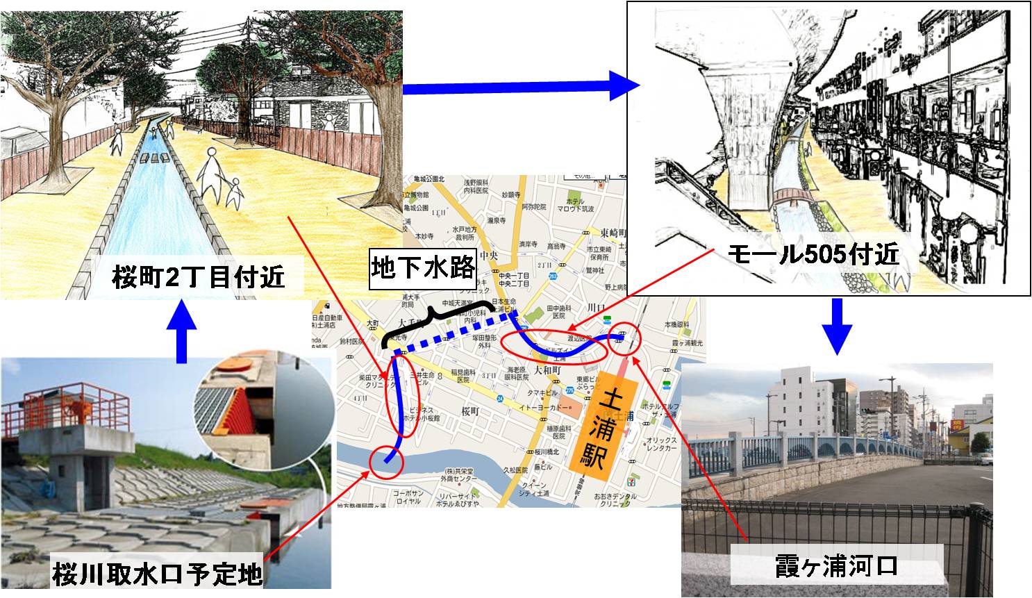 桜川に図3-10のような取水口を新たに設置し、中心部へ水を引く。 桜町2丁目付近は道路の間の使われていない公園のようなスペースを 図のように整備することで、市民の憩いの場として整備する。 次に、桜町2丁目付近からモール505にかけては交通量が多く、 土浦市内の主要な道路なので、地下水路とし、川口まで水路を引く。 さらに、モール505周辺においては図のようにモール505に沿って水路を整備し、 霞ヶ浦までつなぐ。水路整備の事業費は約○○円になっている。 この区画は宅地整備事業の対象地区にも設定しているので、 周辺住民にとっての憩いの場としても整備し、 宅地としての魅力も向上させる。