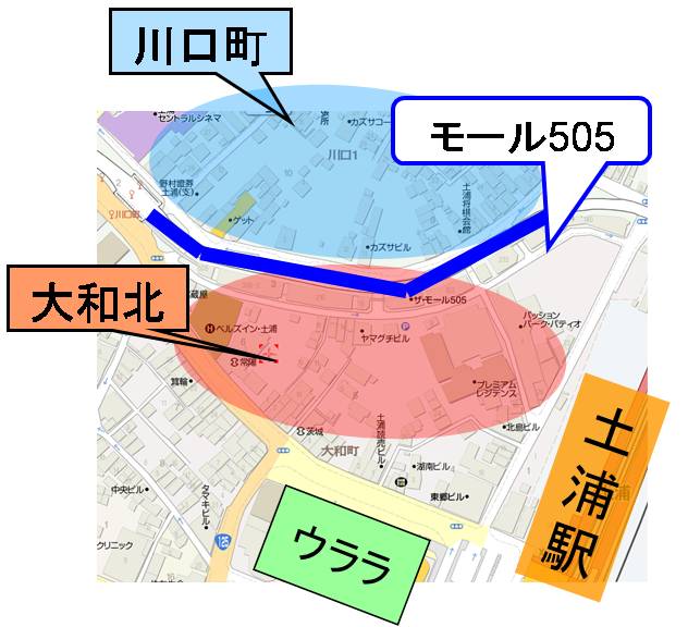 土浦市の中心市街地は、郊外への大型店の進出、 モータリゼーションの進展などにより、近年衰退が激しい。 中心部の大型店は相次いで撤退し、 その跡地に高層分譲マンションが立地してきていて、景観は崩れ、 地域のコミュニティも衰退し、治安も悪いように感じる。