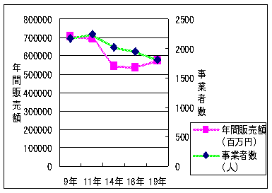 土浦市の商業に関して,年間販売額は横ばい傾向にあり,事業者数は減少傾向にある(図2-5).近年には西友・丸井など駅前大型商業施設が閉店し,中心市街地のシャッター街化(図2-6,2-7)が進み,郊外にはイオンが開店した.今後それらの要因が販売額へ更なる影響を与え,事業者数の減少に拍車がかかることが予想されることから,より一層の中心市街地衰退が考えられる.