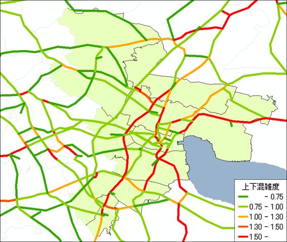 市内にはJR常磐線が走っており,荒川沖,土浦,神立の3駅が市内に位置している.また,線路と並行するように東京から水戸・福島方面へと向かう常磐自動車道と国道6号線が市内を縦断しており,県南の中核都市として恵まれた交通環境を有している.市内にはほかにも市の東西を結ぶ国道354号線や新治・筑波方面と土浦を結ぶ新旧国道125号線が走っている.このような状態は他都市とのアクセス性能面において優れている一方で,通過交通の集中が一部で交通混雑招いている.(図2-11)は現在の市内の交通環境を記録したOD表を元に,JICA-STRADAとArcGISを用いて図示したものであるが,中心市街地や通過交通で多くの自動車が通行する箇所での混雑箇所が見受けられる.また,市内には神立地区を中心にいくつかの工場団地が立地しており,大型車が整備されていない狭隘道路を走行するさまも随所で見受けられる.
