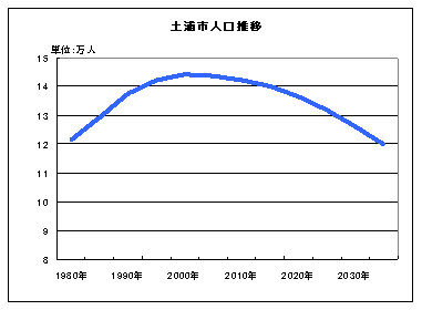 土浦市の人口は144,501人である(2009年12月1日現在).2000年頃まで人口は増加傾向にあったが,その後はほぼ横ばいの推移となっている.また2009年時点では年少人口割合が13.5%,生産年齢人口割合が64.3%,老年人口割合が22.2%となっており,超高齢社会であるといえる(図2-3).さらにコーホート分析によると,20年後の2030年において総人口は125,000人程度となり,大幅な人口減少が予測される(図2-2).年少人口は10%を下回り,老年人口割合も30%を超え,更なる少子高齢化が進む(図2-4).