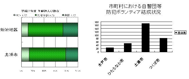 (図2-12 新治地区,土浦市年齢人口割合の比較)     (図2-13 防犯ボランティア結成状況)