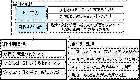 第3章では第2章で述べた市の魅力・問題点を踏まえ,それらを改善し,更により良いものにすることを目的とした,マスタープランの基本構成を述べる.基本構成は、まちづくりの基本理念を元に目指す都市像を示した全体構想から、それらを部門別・地区別に分類し、より詳細な構想を述べるものとする(図3-1)