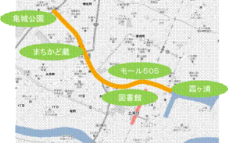 これらの歴史的資源は土浦にしかないものであり,土浦らしさにつながる.そこで,最初の提案としては,歴史資源を活かすことで土浦らしさを感じるまちを目指す. ここではある程度歴史的資源が集まっている中心市街地周辺に焦点を当て,特に亀城公園・まちかど蔵・霞ヶ浦をつなぐ通りを対象とする. では,先程述べた市民が歴史資源と親しめていない原因はなんだろうか.それは1つ1つの「個」の資源に,市民がわざわざ訪れるほどの魅力がないからではないだろうかと考える.「個」としての魅力を上げるというのはもちろんだが,より広域的な視野に立ってみると歴史資源が近接しているという点を活かしたら新たな解決策が見えてくるのではないか.つまり,これらをつなげて「地域」としての魅力を高めることで,市民がより歴史資源に触れ,土浦らしさを感じるのではないかというのがこの提案の主旨である. |