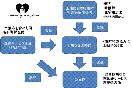 ・市境なき医師団の設立 将来の需要対策として公民館の施設に医療福祉サービスを提供できる「市境なき医師団」というNPO法人を設立する.システムは図20のようになり,土浦市と近隣都市が協力し設立する.医者は医師団に登録し,指定した日にちに公民館に派遣される.住民は会員になり気軽に公民館にいき医療サービスを受けることが可能になる. 運営資金 ・NPO法人化することにより,補助金や減税の対象 ・各市町村の助成金 ・企業による寄付金 ・住民の年会費,寄付金 これにより,より身近に医療サービスを受けられるようになり将来の需要を満たせる.また公民館に集まることにより,地域の交流の場にもなり孤立する人を減らせることができる.