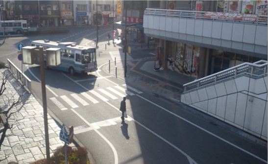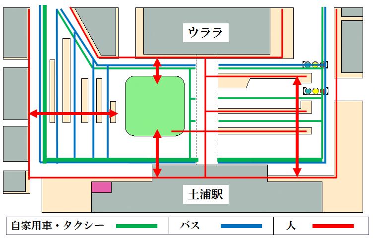 土浦駅西口ロータリーの現状として、ウララと土浦駅ビルを結ぶペデストリアンデッキがあり、動線が危険に交差しない駅前広場となっているが、既存の横断歩道や歩道を利用せず、車道を斜めに横断する利用客が多く、通勤時間帯となるとバスの往来も激しく、これにより歩行者とこれにより歩行者と路線バスの導線が交差しており危険な状態である。