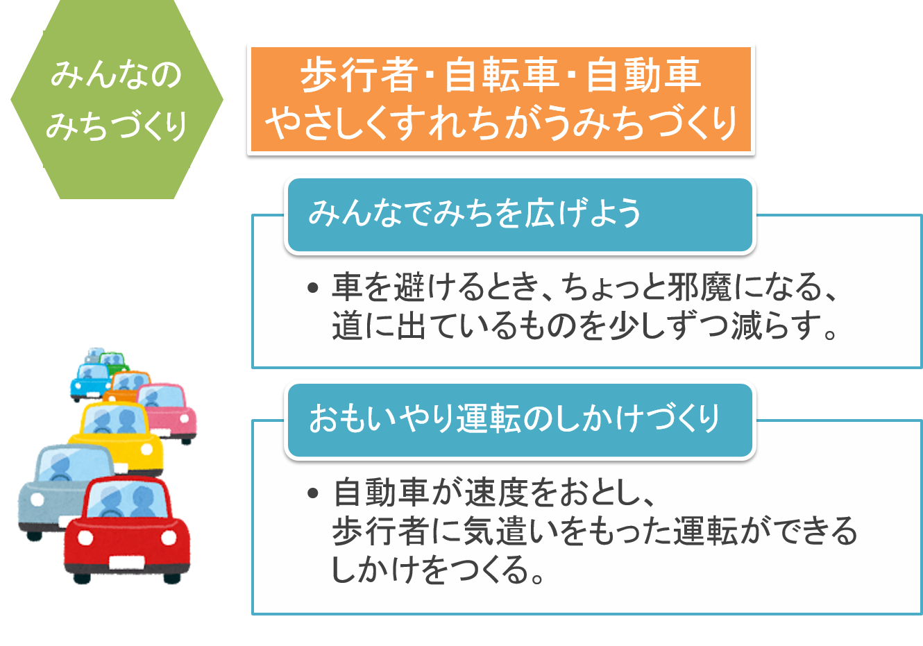 歩行者、自転車、自動車みんなが優しくすれちがうみちづくりを進める。そのために2つの施策を提案する。1つ目は、「みんなでみちを広げよう」という取り組みである。道路上の白線と敷地の間にあるものをできる限り取り除き、道を広くする試みである。例えば、公園のフェンスを外す、張り出した垣根をコンパクトに剪定する、茂みの雑草を抜くといったことである。これにより、車が来たとき、歩行者が内側に入るスペースを確保できる。2つ目は「おもいやり運転のしかけづくり」である。自動車や自転車は歩行者の存在に気づき、急ブレーキ急発進をしない、速度を落とすなどといった思いやり運転が求められる。歩行者優先の道であることを気づかせるため、街路路上にイメージハンプを施したり、白線や塗装の工夫をして道を狭く見せたりし、心理的に速度を制限させる。