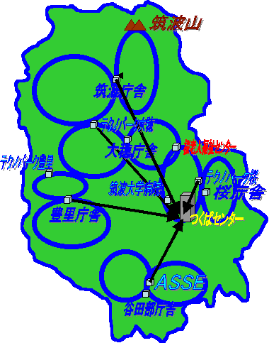 | 乗客ヒアリングの中で"運転手の運転が荒い""車椅子利用の方、高齢者の方の乗降に時間がかかる"などの意見があった。そこから現在のダイヤに無理があるのではと考えてみた。計算してみると現在のダイヤは時速30km強で設定されている。関東鉄道からの意見にもあったとおりこれでは速すぎるといえるので、新たなコースを設定して、もっと余裕のあるダイヤを組むべきではないだろうかと考えた。 提案する新コースは、各庁舎内コースを5コース設定し、各コースのセンター(庁舎や商店街など)とつくばセンターとを結ぶシャトルバスを運行させる。それぞれのコースに現在利用しているのりのりバスを配置し、シャトルバスは関東鉄道等の民間バス会社に委託するという仕組みである。現在のコースより1周を短く設定し、待ち時間が短くなるようにしてある。また、商店街などを拠点に選んだのは、待つことになったとしても時間をつぶす場所があるからである |