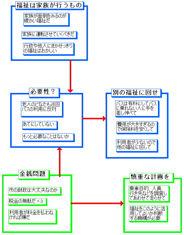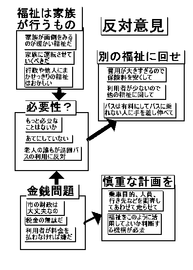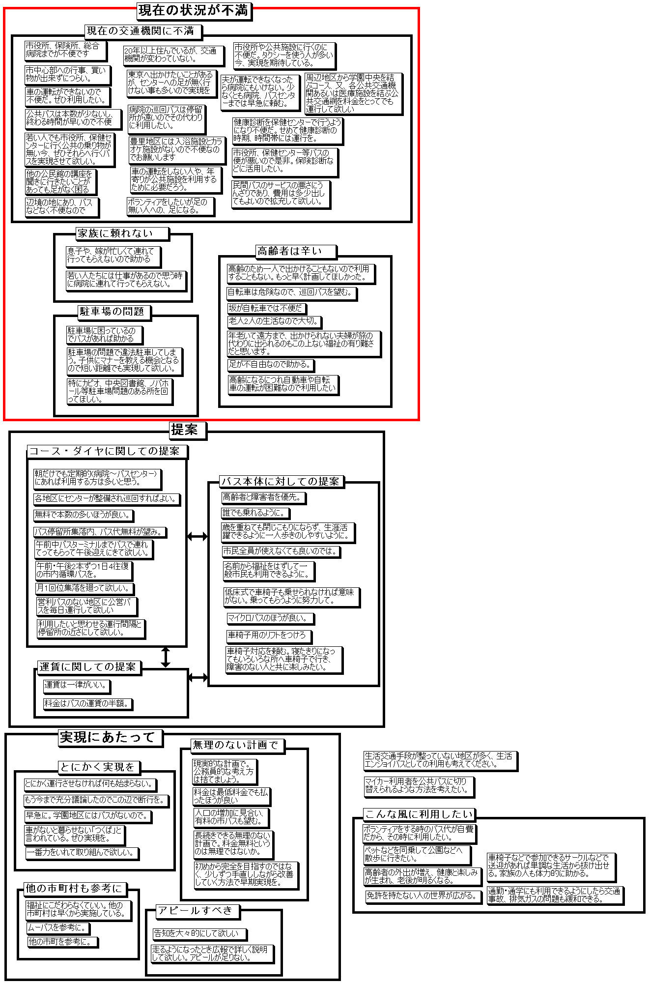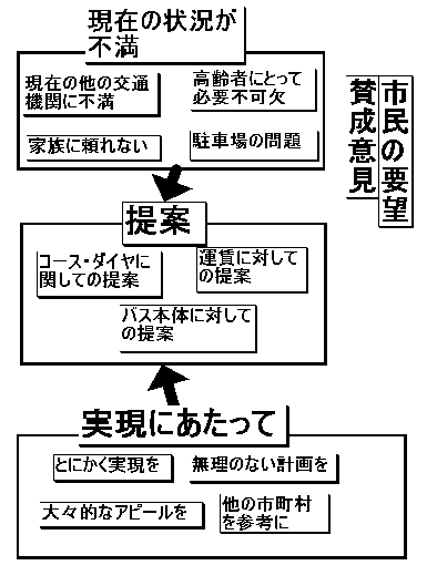 ・福祉循環バスの運行が開始される際につくば市が行ったアンケートの自由回答部分に対する回答を、KJ法を用いて分析した。