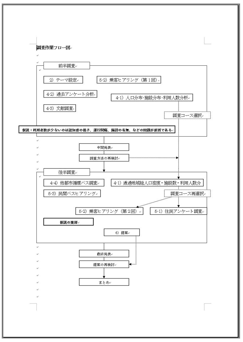 過去アンケートの分析や利用人数と人口の関係などを調査し、「利用者数が少ないのは認知度の低さ、運行間隔、施設の有無、などの問題が原因である。」という仮説を立てた。後半調査ではこの仮説を証明するために、調査するコースを絞ってアンケート実施などを行っていくという計画になった。 |
