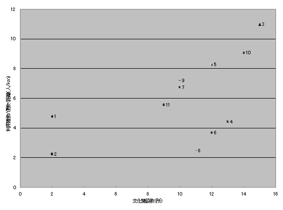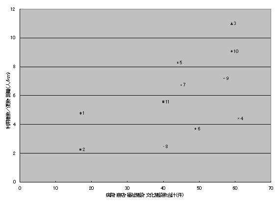 | 利用人数と各施設数との相関係数 病院 0.4088 一種大型店舗数 0.5734 二種大型店舗数 0.6782 大型店舗数合計 0.694 福祉施設数 -0.00678 文化施設数 0.5724 福祉・文化施設数合計 0.4994 総施設数合計 0.57488 |