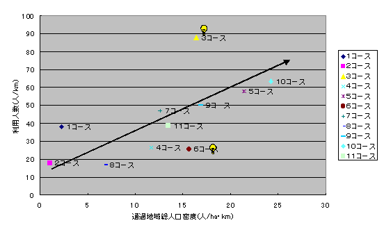 | この表からは、6コースと4コースがその人口数の割に利用乗客数が少ないことが分かる。しかし、この表は地域の面積を考慮しておらず、面積が広いところは人口も多いだろうし、小さいところは少ないと思われる。よって、この点を考慮するために、地域の人口密度を求め、各コースにおいて共通の指標となるようにし、次のAでそのことについて述べる |