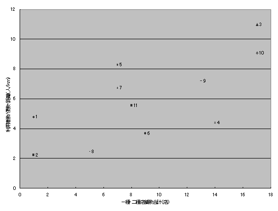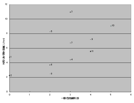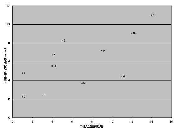![]() 図4-1-5 二種大型店舗数と利用人数の関係 |