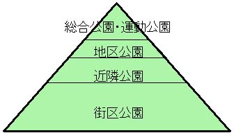 都市公園は、大きく4つの階層に分けられている。規模の大きいものから順に、総合公園・運動公園、地区公園、近隣公園、街区公園となっており、階層が上になるにつれて、その誘致圏も大きくなる。(図1)また、それらの概要を表1に示した。