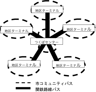 ![]() 現在のつくば市のバス体系には、関鉄バスとのりのりバスの路線の重複による非効率、一路線あたりの走行距離が長い等の問題がある。これらを効率良く回すことによってバスの利便性は向上すると考え、そのための提案としてセンター・オブ・センター構想というものを考えた。