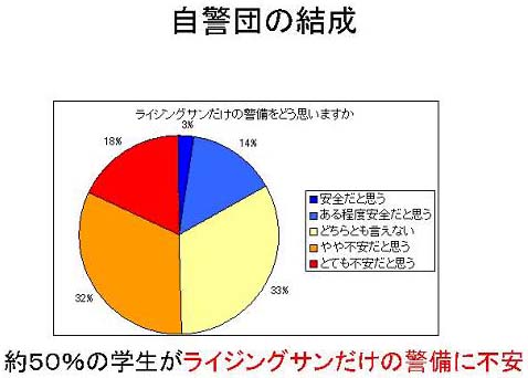 に行ったアンケートの中に「ライジングサンだけによる警備をどう思いますか」という質問を行ったところ、約半数の学生がライ