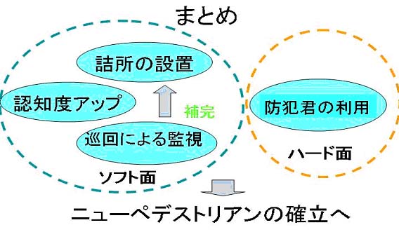 人通りの少なさの問題を解決できると考えている。加えて、ペデストリアンに防犯君や詰所設置、巡回の実施をすることにより、