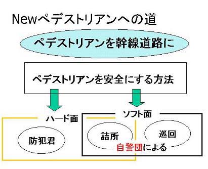 まず、既存のペデストリアンを幹線道路にするためには、ペデストリアンをより安全なものにすることが重要である。安 全にするには、ハード面とソフト面という2つからの視点がある。私たちが考えたものとして、ハード面では、既存の非 常電話に改良を加えた「防犯君」の設置、ソフト面では、学生から組織された自警団による「巡回」、ソフト面とハード 面を融合したものとして「詰所」がある。以下「防犯君」、「巡回」、「詰所」の3つについて述べていきたい。