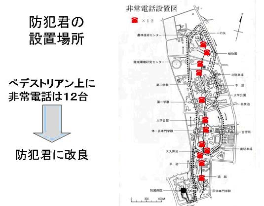 最終的には、学内すべての非常電話を防犯君にすることが望ましいが、ペデストリアンの安全性の向上を第一としているため
