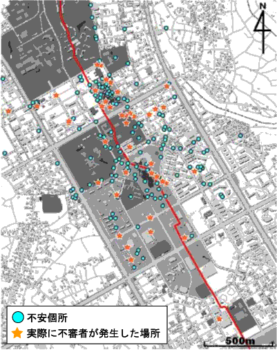 <アンケート結果の考察> A地区の特性として、子供たちの不審者に対する不安が大きくなっていることがわかった。 各地区に共通して言えることとして、情報共有の不足があげられる。ここでの情報とは実際に起こった事件についての情報だけでなく、日常にどのような活動・指導を行っているかという情報も当てはまる。 一方、保護者の防犯意識が高いことも見て取れる。そのため、PTAを単位とした活動が拡大していることがわかった。しかし、上記の「自転車パトロール」は実際には自転車の籠にプレートをつけているだけで、綿密に計画されたようなパトロールではないこともわかった。 Bヒアリング調査 アンケート調査までの集計結果と考察をもとに原案を作成し、それに対する意見を警察・学校・PTAからいただいた。 共通の認識