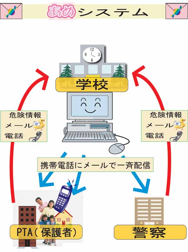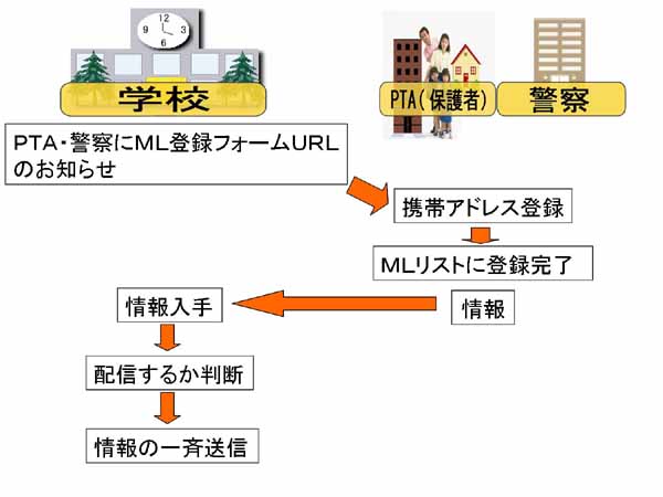 ※メーリングリストという手軽なツールを用い、学校の負担を減らすよう考慮した。 PTAや警察から学校に不審者発見などの連絡があった場合、管理者の学校は、その情報を受け取り、メーリングリストで配信する。 ![]() 図10:あめシステム概要 「あめシステム」管理者の学校はメーリングリストを作成し、書面でシステムの概要を伝え、PTA・警察に参加を呼びかける。PTA・警察は学校が指定したメーリングリスト登録フォームにアクセスし、メールアドレスを入力し登録する。 学校はPTA・警察から不審者情報を受けると、その情報を配信するかを判断し、必要に応じて、参加者にメールを配信する。 ![]() 図11:あめシステム手順 あめシステムを導入すると、今まで希薄だった情報共有が確立すると期待される。 ![]() 図12:あめシステム導入後 【防犯MAP】 次に防犯MAPを提案する。