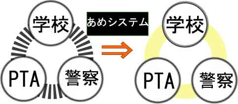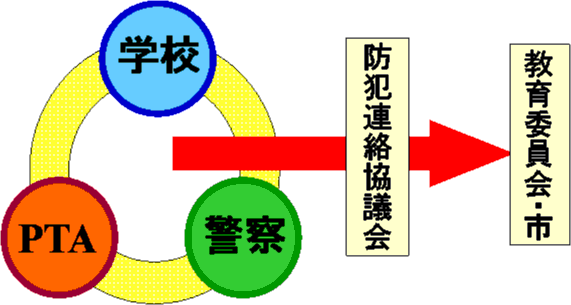 防犯連絡協議会を導入すると、今までなかった意見交換の場が確立され、各主体のとりまとめや、市・教育委員会へのハード面などの要請が期待される。 ![]() 図19:防犯連絡協議会導入後 |