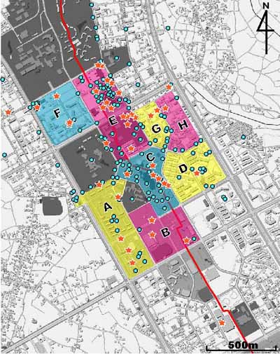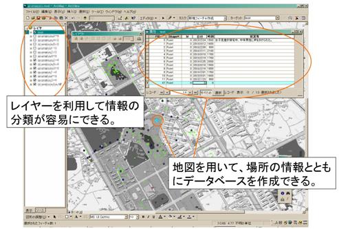 <防犯MAP(GISソフト使用)> また、GISソフトを用いた防犯MAPの作成も提案する。専門的な技術とソフトを購入する必要はあるが、ソフトの使い方さえマスターすれば、より効率的・機能的に情報の処理が行え、大量の情報をデータとして蓄積することができるので、将来的に導入が期待される。 ![]() 図13:GISソフトによる防犯マップ 防犯MAPが導入されると、今まで整理されないままになっていた事件情報の集計がされるため、各主体の防犯活動への活用が期待できる。 ![]() 図14:防犯マップ導入後 【新・防犯パトロール】 新たな防犯活動として「新・防犯パトロール」を提案する。