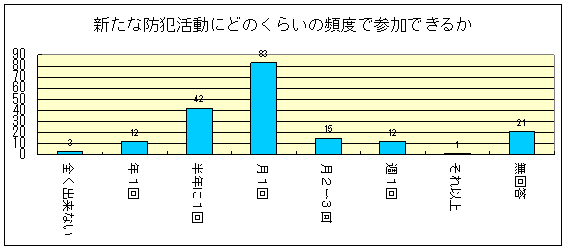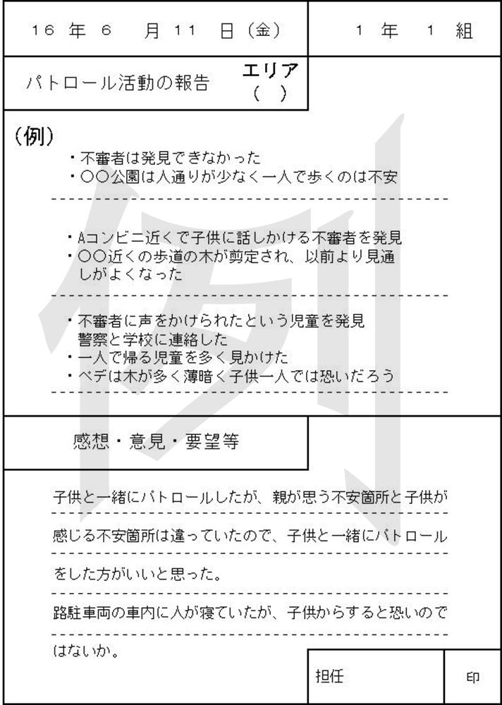 まず、当番は児童の下校時間に学校に集合し、4―5人のグループに分かれ、危険箇所・不安箇所MAPに基づいて、指定された区域内のパトロールを行う。 A小学校では、学校全体で25クラスあるので、週2回のペースでパトロールを行うと、各クラスは3ヶ月に1度担当がまわってくる。 この3ヶ月に一度という頻度の設定基準は、下図の「新たな防犯活動にどのくらいの頻度で参加できるか?」というアンケート結果から、「月1回」または「半年に1回」と答えた人が全体の66%に基づいている。 ![]() 図15:アンケート結果(新たな防犯活動にどのくらいの頻度で参加できるか) パトロールの日時はあらかじめ学校で指定をし、保護者に知らせておく。原則全員参加だが、やむを得ない理由で出席できない場合はあらかじめ代わりの人を見つけておくことを義務付ける。また、1世帯に複数の児童が在学している保護者は、一人の児童のクラスのパトロールに出席するだけでよいことにする。 ・パトロールエリア分類 A小学校の児童・保護者に行なったアンケート調査を基に作成した危険箇所と不安箇所が示されたMAP上の地域を、今回A小学校近隣地区を中心に下図のように8つのエリアに分けた。「新・防犯パトロール」ではこれらのエリアを偏りなくパトロールしていくのである。担任がグループごとに回るエリアを指定し、その地区内をMAPを基にパトロールする。 ![]() 図16:パトロールエリア分類図 パトロール終了後は一度学校に戻り、担任からパトロール日誌を受け取り、記入を行なう。日誌記入後、クラス担任は不審者発見があった際には、防犯MAPに印をつけ、日誌を次のパトロール日のクラス担任に渡す。不審者発見等の報告があった場合は警察と連携を取るなどの対応を行う。 ・パトロール日誌 パトロール日誌には、不審者発見の情報やパトロールで気づいた問題・またパトロールをしての感想や意見・要望などを書く。防犯面で改善された点なども書きとめ、パトロールエリアごとに活動を記録に残していきます。パトロールの反省や感想などを記録として残すことは、パトロール活動の改善・充実、さらには防犯活動のレベルの向上にも繋がる。また、パトロール日誌はPTAの安全委員会に内容をまとめてもらい、防犯連絡協議会での問題提起や要望として反映させる。 ![]() 図17:パトロール日誌記入例 新・防犯パトロールを導入すると、今まで不十分だった子どものためのパトロールが確立され、監視性の強化が期待される。 ![]() 図18:新・防犯パトロール導入後 【防犯連絡協議会】 最後に防犯連絡協議会を提案する。