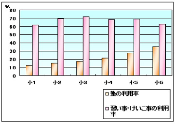 以下の図は、塾・習い事の利用率を学年別に示したものである。