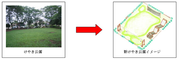 千現地区にあるけやき公園は、外からの見通しを良くするために、木を少なくし、開放感を出す。