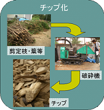 5−3.植物残渣利用の現状把握(総量2308t) ヒアリングから、回収されている植物残渣の大半は、チップ化されていることがわかった。利用法は、土の表面に敷き詰めるマルチング材(雑草の育成を阻害するもの)、もしくは堆肥が大半を占めた。また、一般廃棄物として処理されて、発電用のエネルギーとしての利用が把握された。その他には、建材用の合板への利用、芸術作品への利用が把握された。