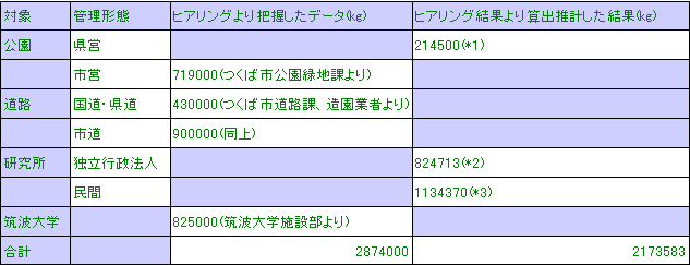 以下に、公園、道路、研究所、大学それぞれの植物残渣量をまとめました。